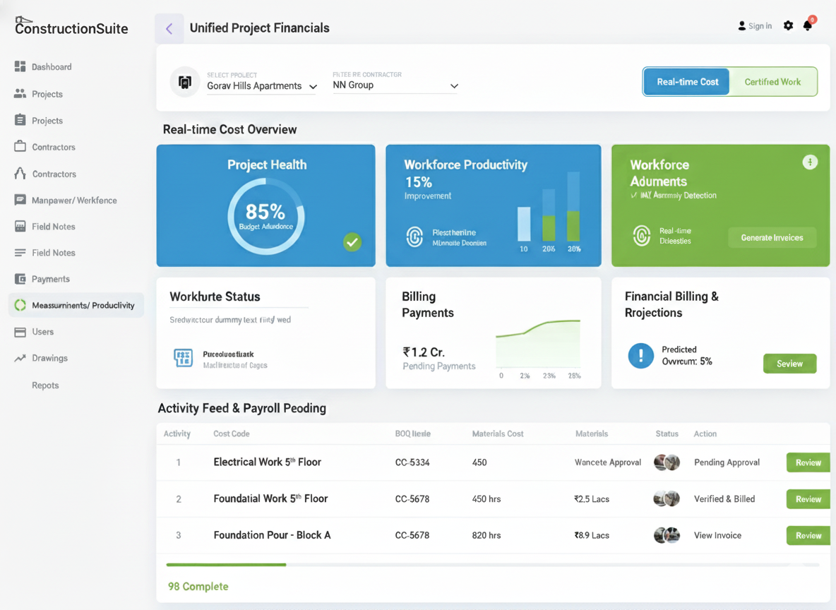 Build construction finance suites, real-estate tokenization, and cost optimization systems with biometric workforce integration.